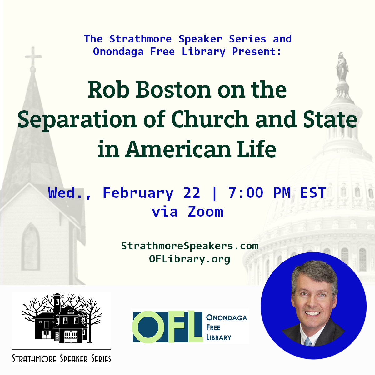 Join the Strathmore Speakers Series and Onondaga Free Library for an evening with Rob Boston, Senior Adviser at Americans United for Separation of Church and State, for an important discussion of the role the separation of church and state has played, and continues to play, in American life. “The ‘wall of separation between church and state’ is,” American United argues, “an American original—an American invention born in the Enlightenment, but first implemented in the great ‘American Experiment.’ Until then, no other nation had sought to protect the people’s right to think freely by separating religion and government.” Mr. Boston will provide a historical overview of this “wall of separation,” and highlight the ways in which Americans of all religions, creeds and political persuasions have sought to defend or compromise this uniquely American ideal. A brief Q&A will follow Mr. Boston’s talk.